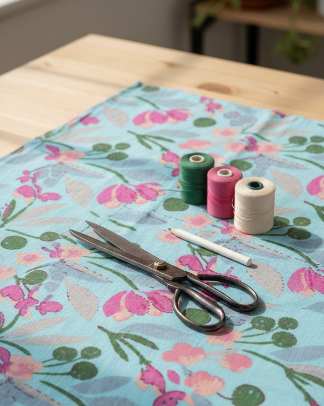 - Eye-catching pink floral print on vibrant blue fabric