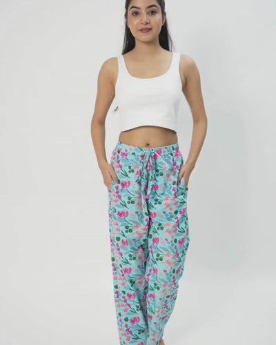 Cotton Pajama Pants Women - Floral Azure